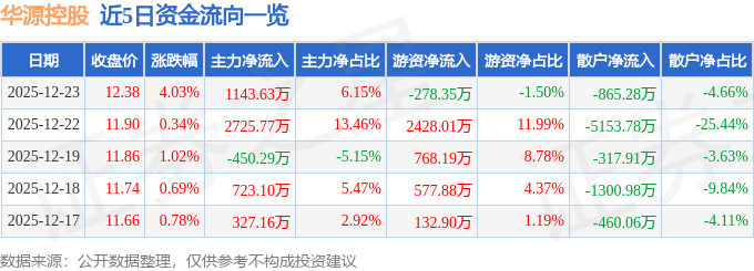 证券之星音讯,到2025年12月23日收盘,华源控股(002787)报收于12.38元,上涨4.03%,换手率6.08%,成交量15.24万手,成交额1.86亿元。