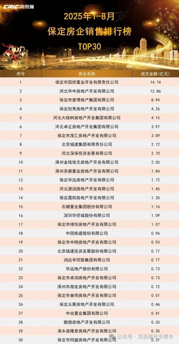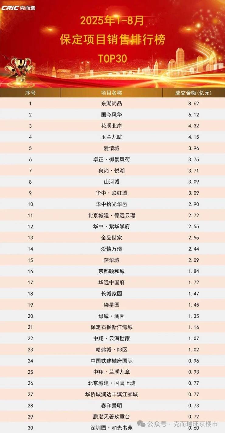 开云官网:克尔瑞丨2025年1-8月保定房企项目排行榜发布
