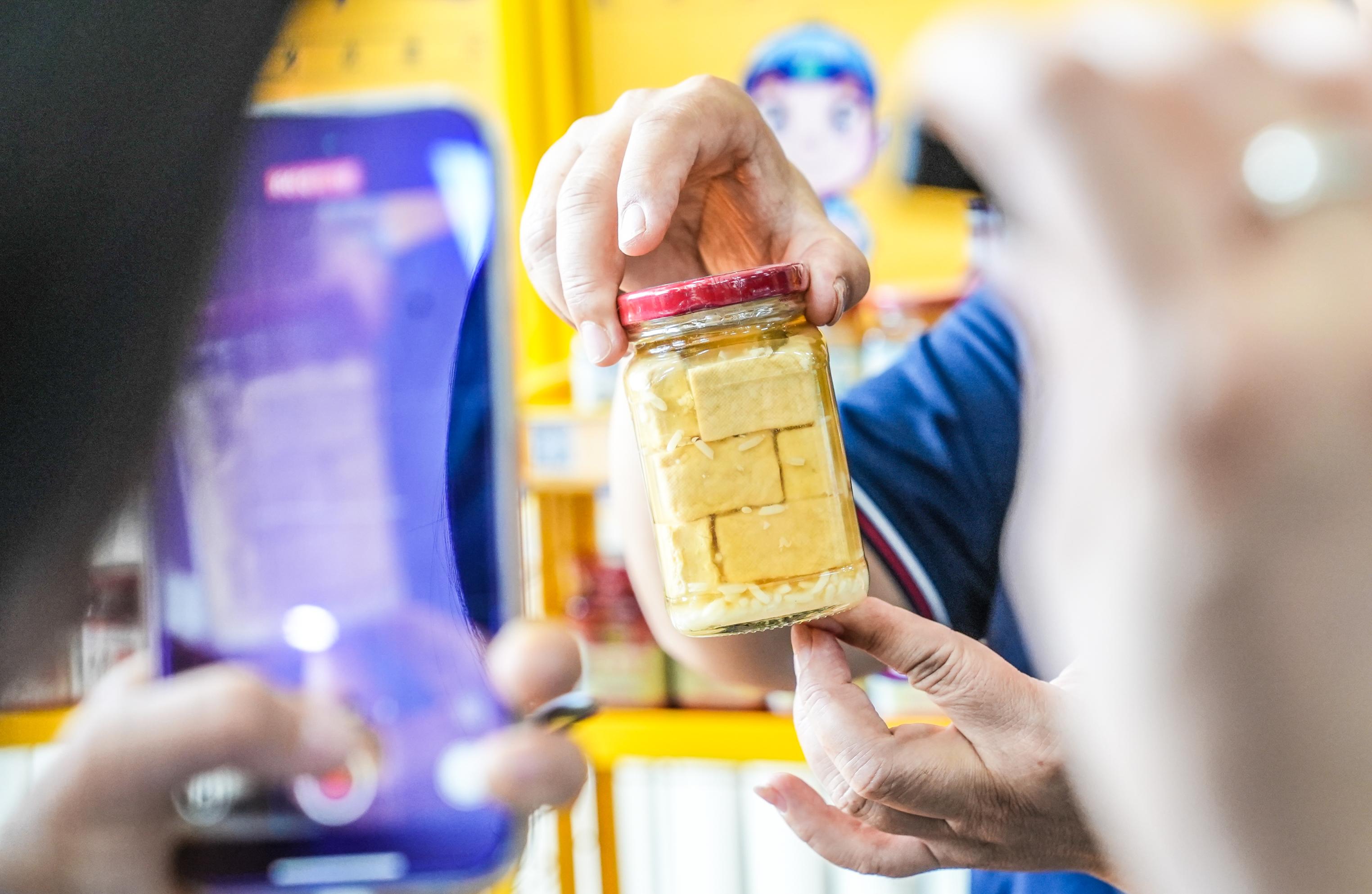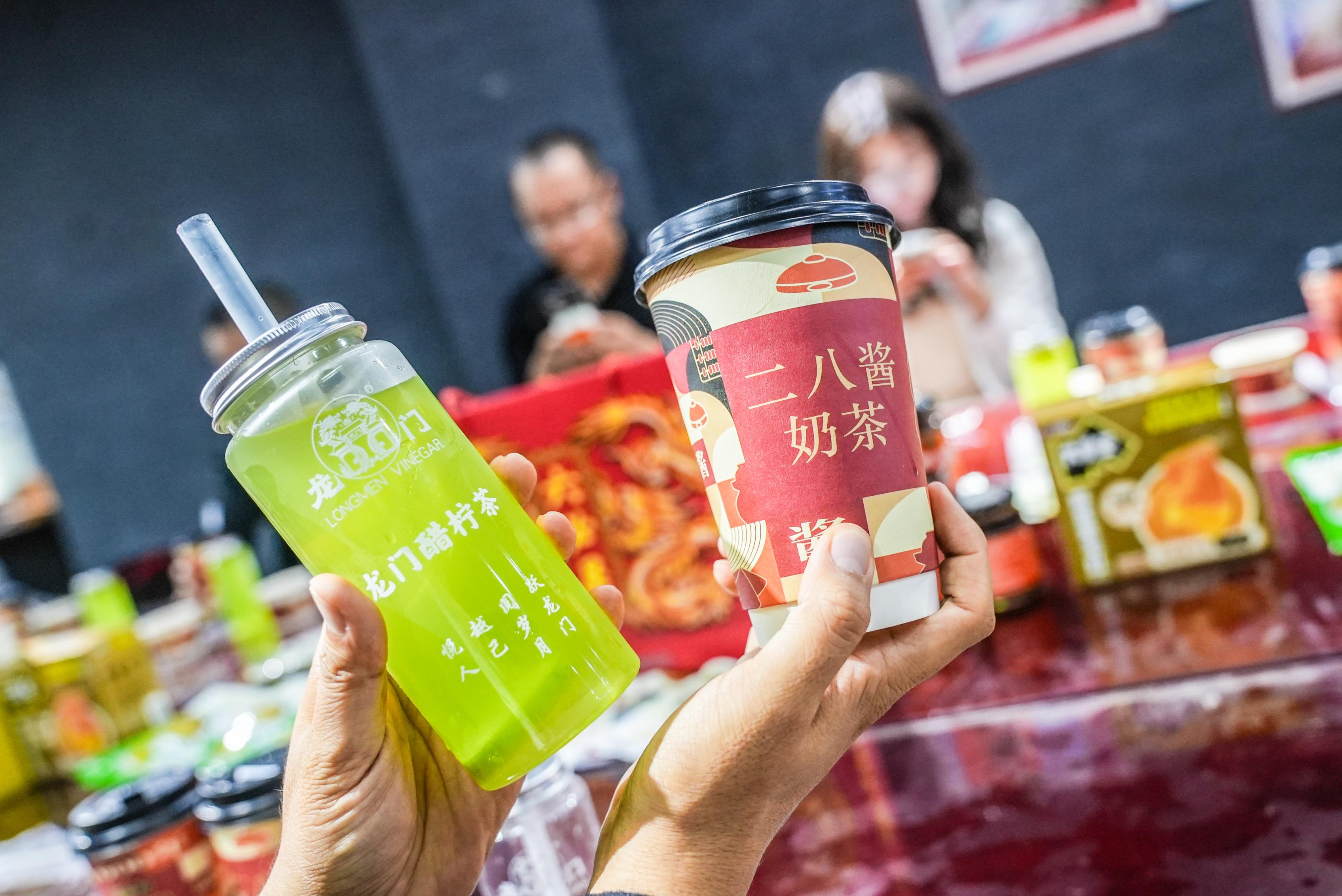 图为顾客展现六必居现制现售的二八酱奶茶、龙门醋饮料。现在,六必居不只将传统酱菜的老滋味保存下来,立异的黑蒜冰淇淋、二八酱系列新品露脸,掀起打卡热潮,遭到年青顾客好评。