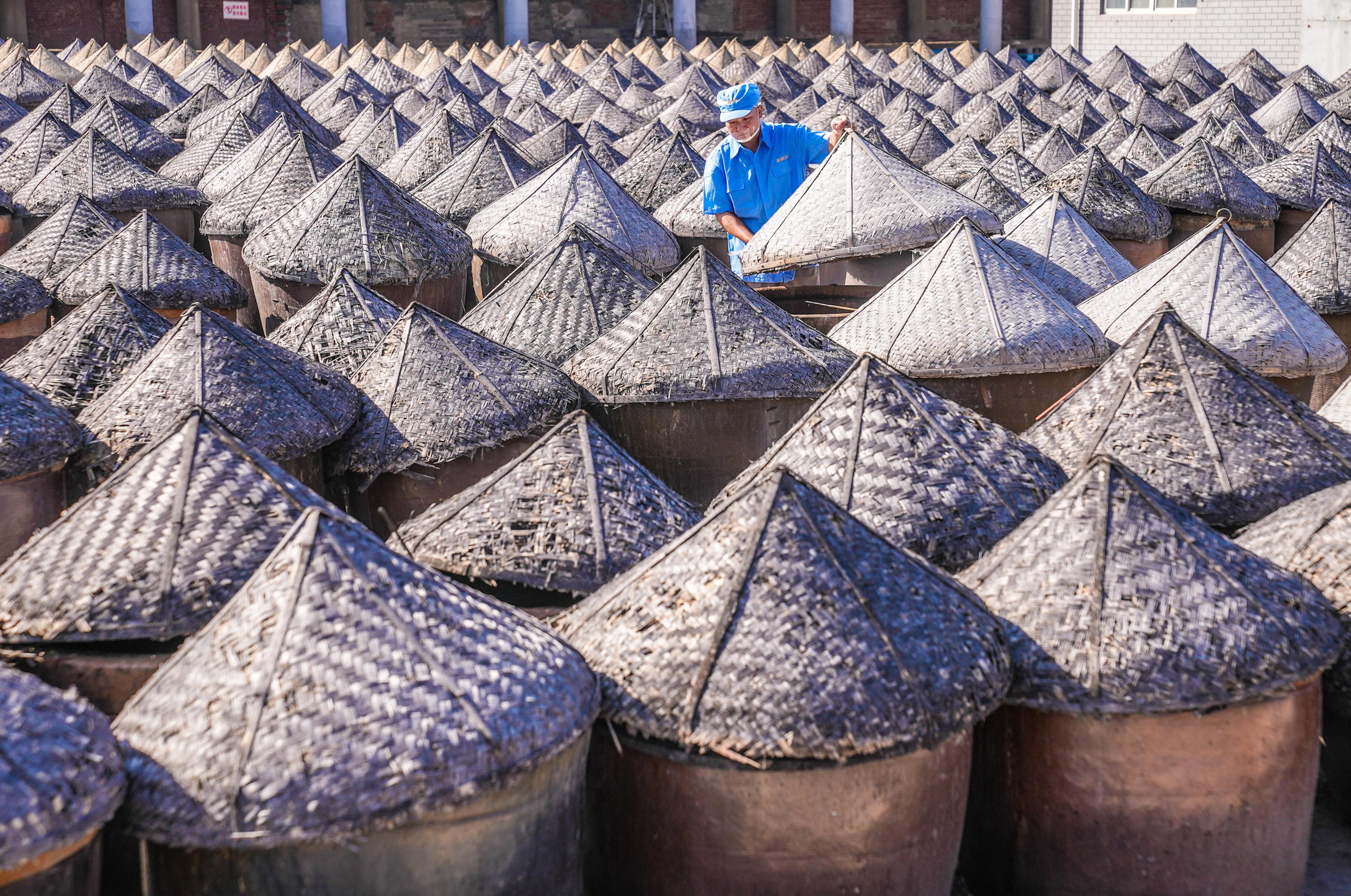 六必居酱园内,工作人员在检查酱油酿制状况。始自明正统元年(1436年)的六必居,至今已走过近600年进程。
