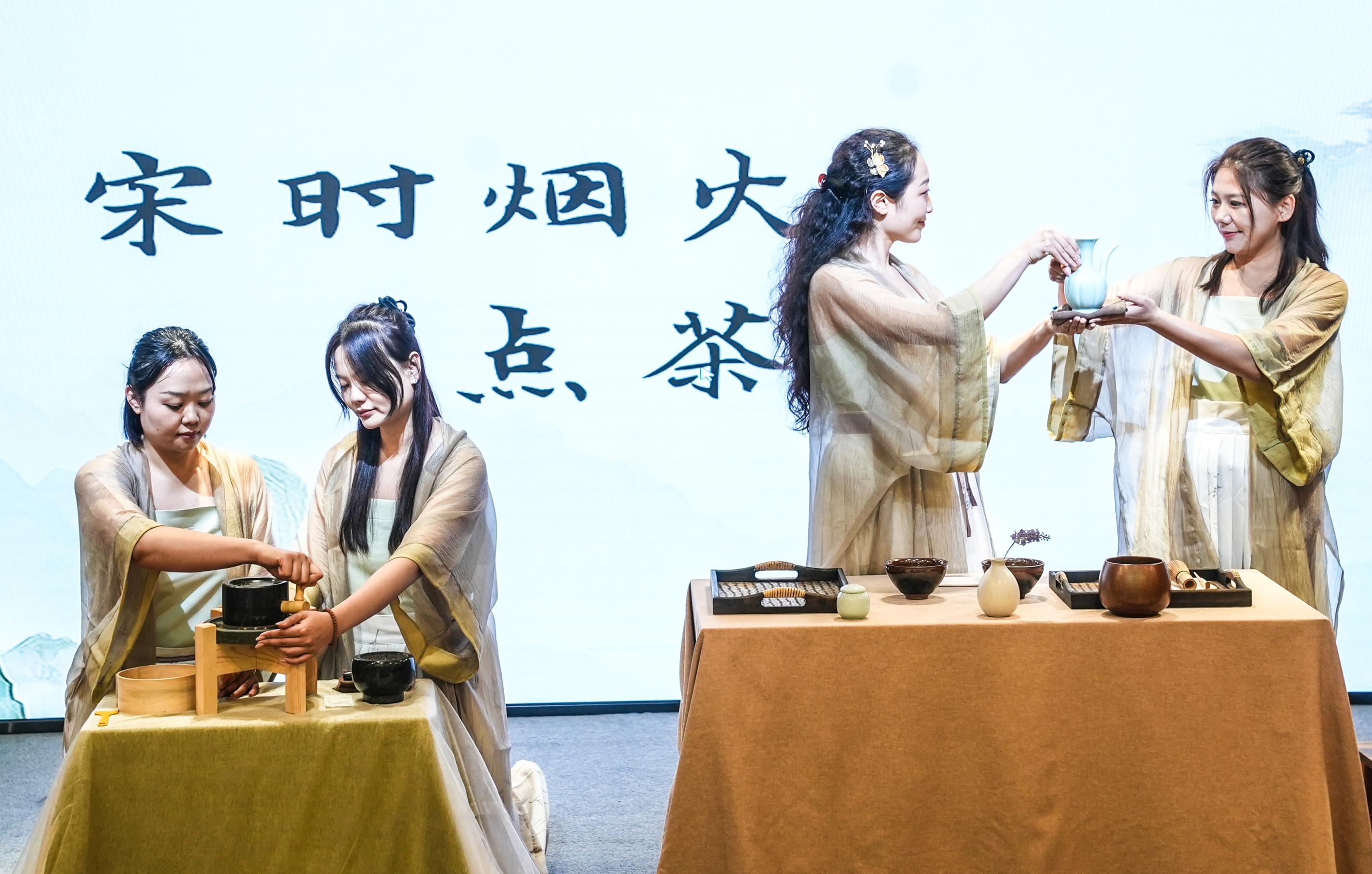 成立于1950年的京华茶业,具有新中国第一批茶叶类注册商标“京华”品牌。京华茶业具有西城区非物质文明遗产北京花茶拼配工艺,现在已传至第七代传承人。图为京华茶叶工作人员在展现宋代点茶。